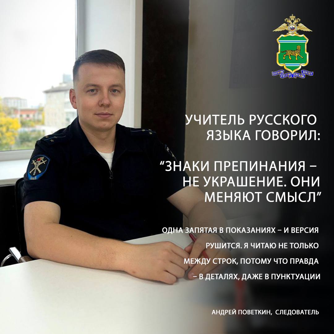 Следователь следственного управления УМВД России по Еврейской автономной области старший лейтенант юстиции Андрей Поветкин вспоминает слова своего учителя русского языка, которые помогают ему на службе.