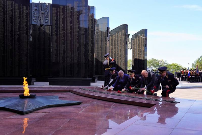 В завершении праздничного мероприятия курсанты прошли торжественным маршем по площади Славы. Затем руководство ДВЮИ МВД России и почетные гости возложили цветы к Вечному огню и мемориалу воинам, погибшим в локальных войнах.