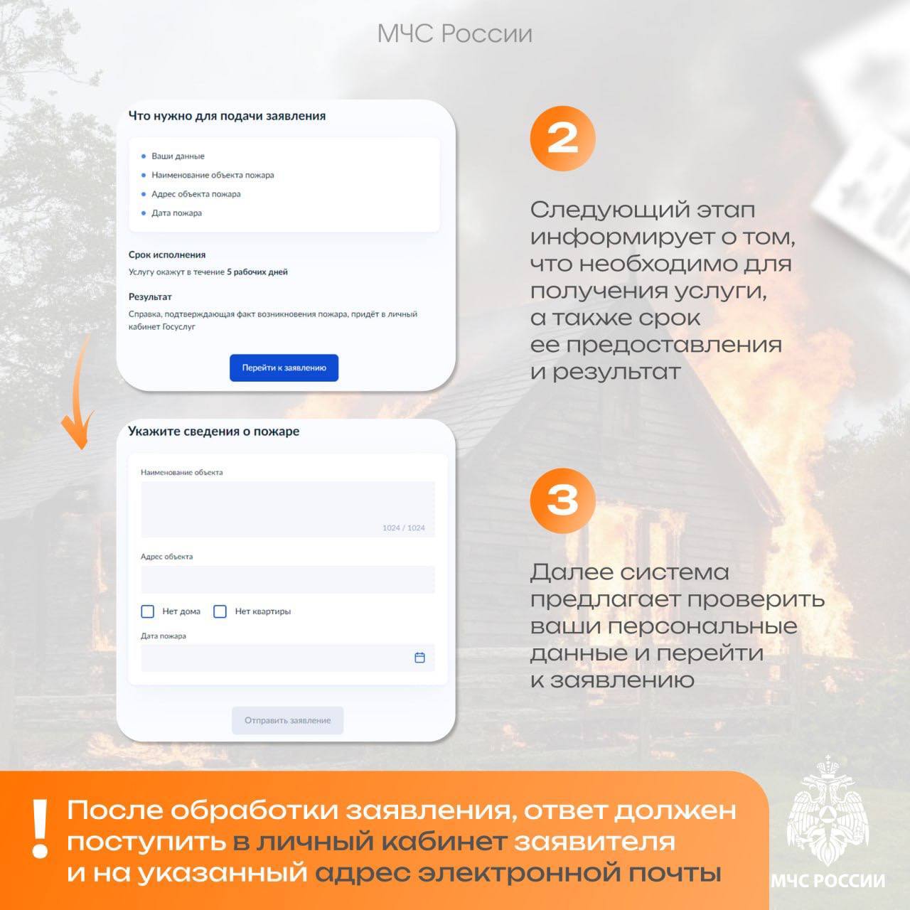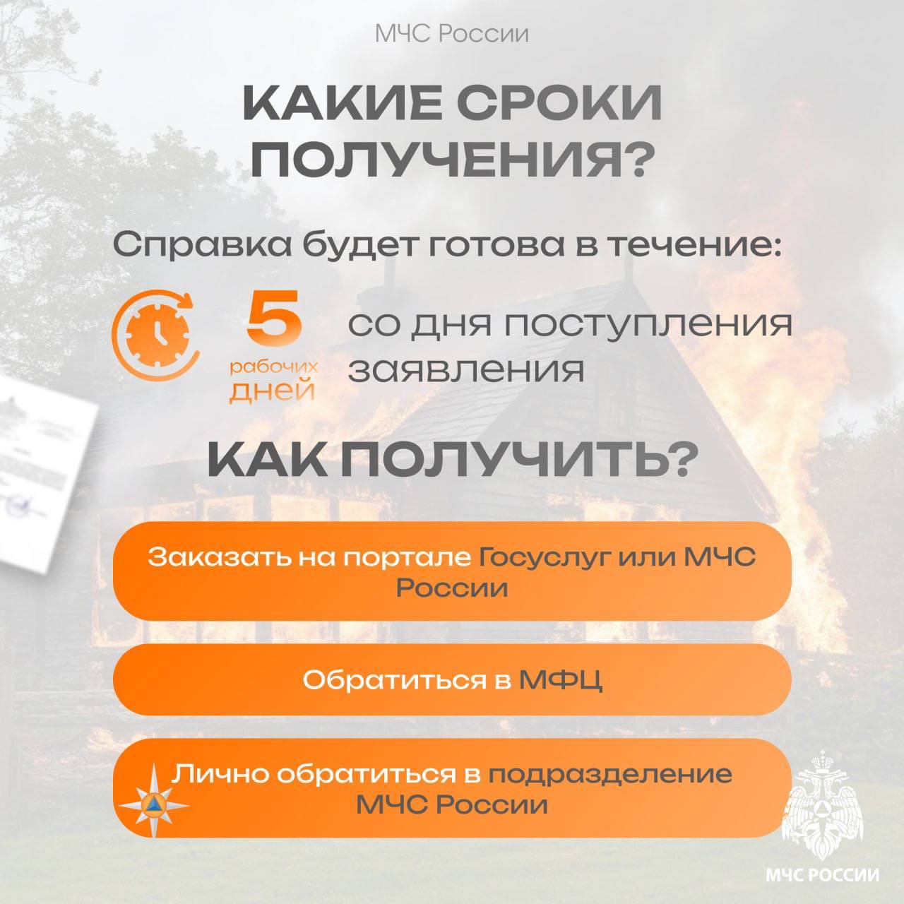 На портале «Госуслуг» можно воспользоваться функцией «Предоставление справки, подтверждающей факт возникновения пожара». Для чего необходима справка - смотри в памятках МЧС России.