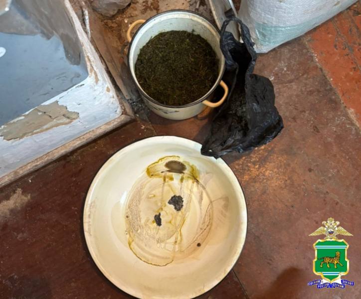 Правоохранители задержали 40-летнего местного жителя. В ходе обследования его домовладения в кухне обнаружены и изъяты два полимерных пакета, мешок с растительной массой, а также металлическая кастрюля с веществом зеленого цвета со специфическим запахом.