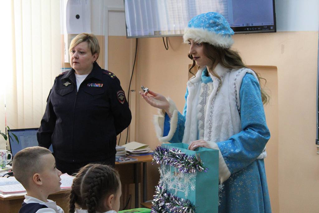 Затем в гости к ребятам пришла Снегурочка. Она познакомила школьников со специальными средствами, которые полицейские ежедневно используют на службе.