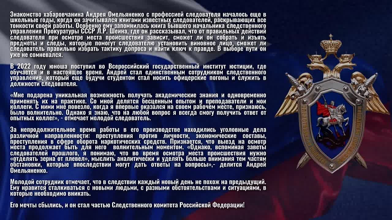 Знакомьтесь, младший лейтенант юстиции Андрей Омельяненко – старший следователь следственного отдела по Железнодорожному району города Хабаровска следственного управления Следственного комитета Российской Федерации по Хабаровскому краю и Еврейской автономной области