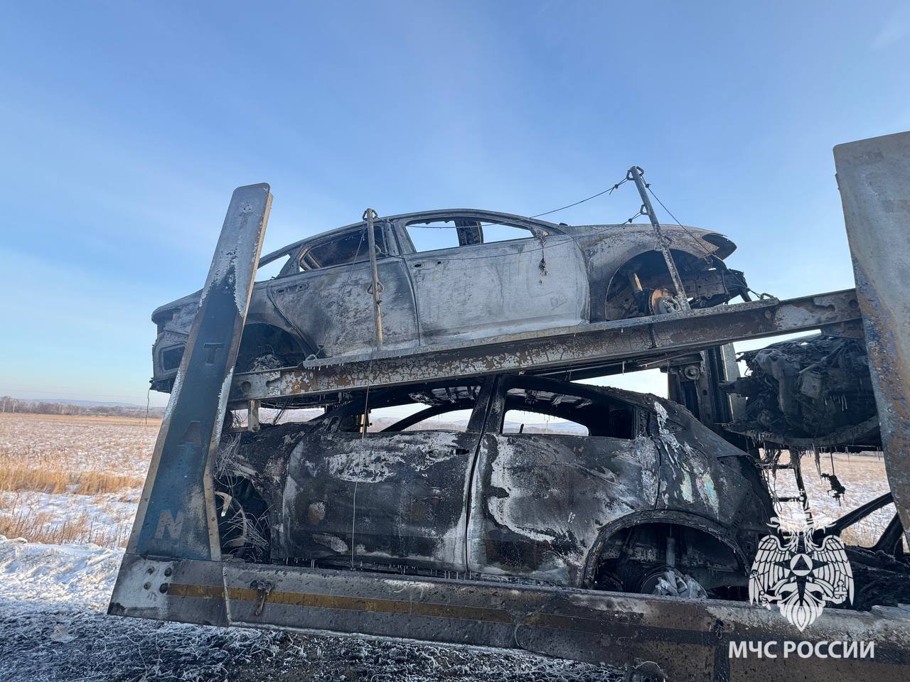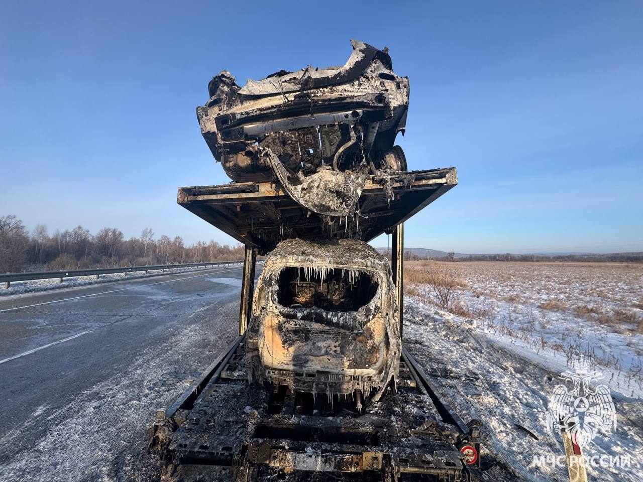 ЧП случилось на федеральной трассе близ города Облучье. Водитель заметил дым из прицепа с дорогим грузом и остановил машину. Он пытался потушить пожар огнетушителем, но безуспешно - порывистый ветер быстро раздул пламя. Тогда мужчина отцепил грузовик от полыхающего прицепа и отогнал на безопасное расстояние.