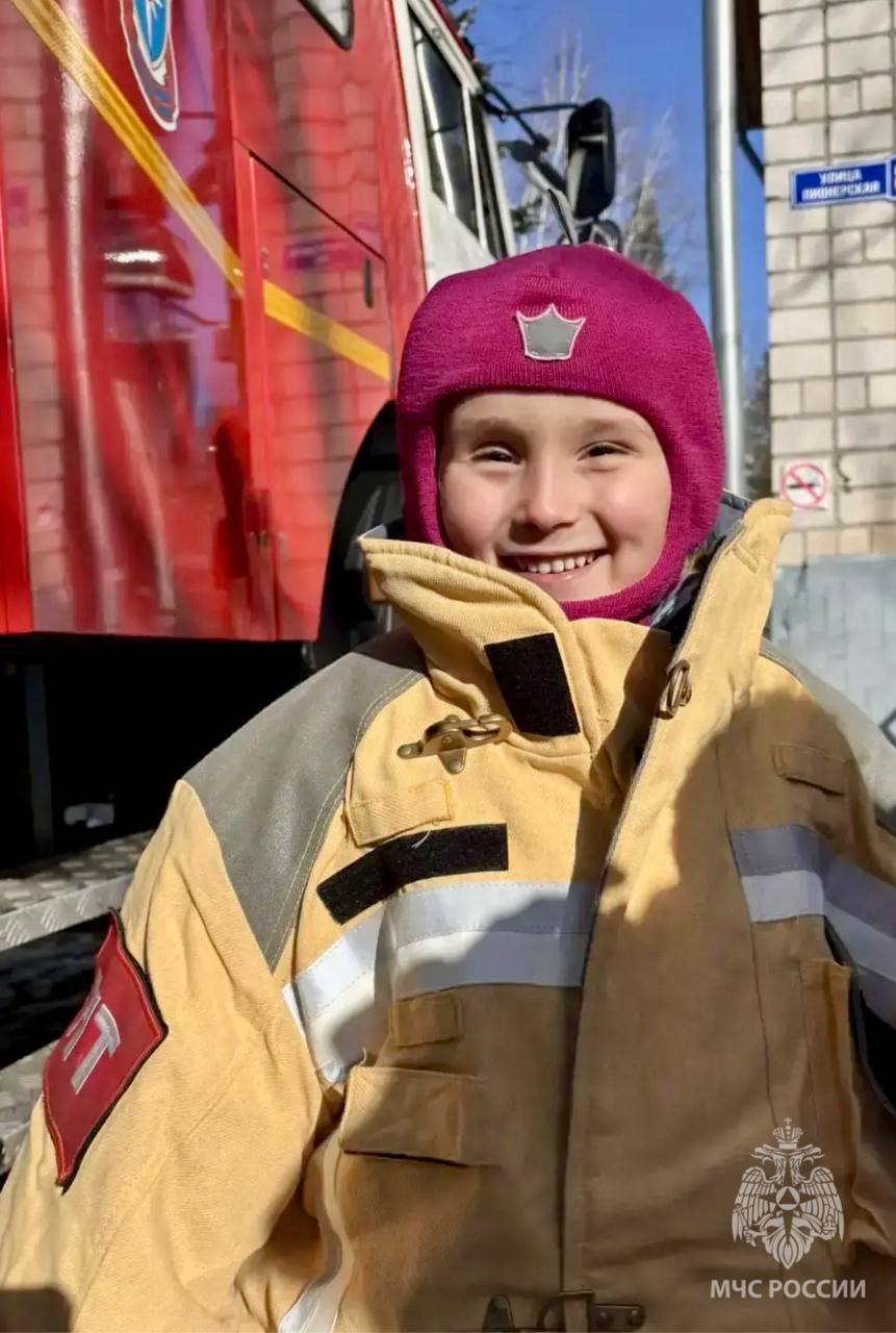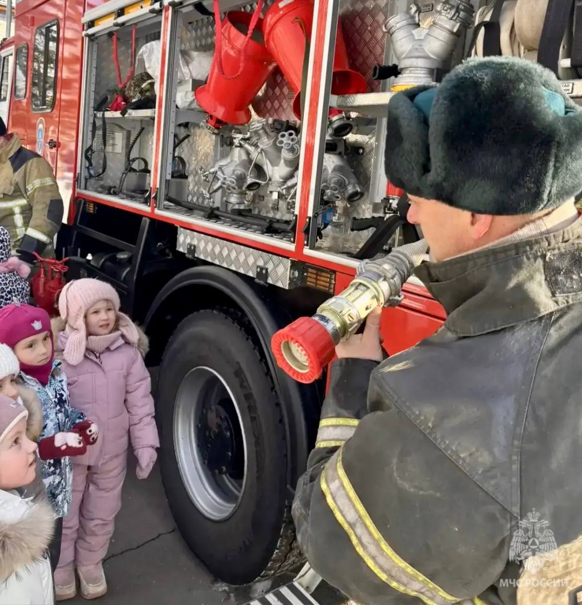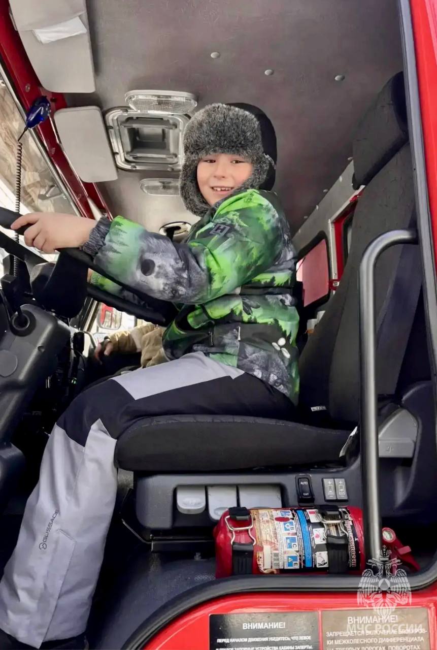 Малыши примерили настоящую "боёвку" огнеборца и побывали внутри пожарного автомобиля.