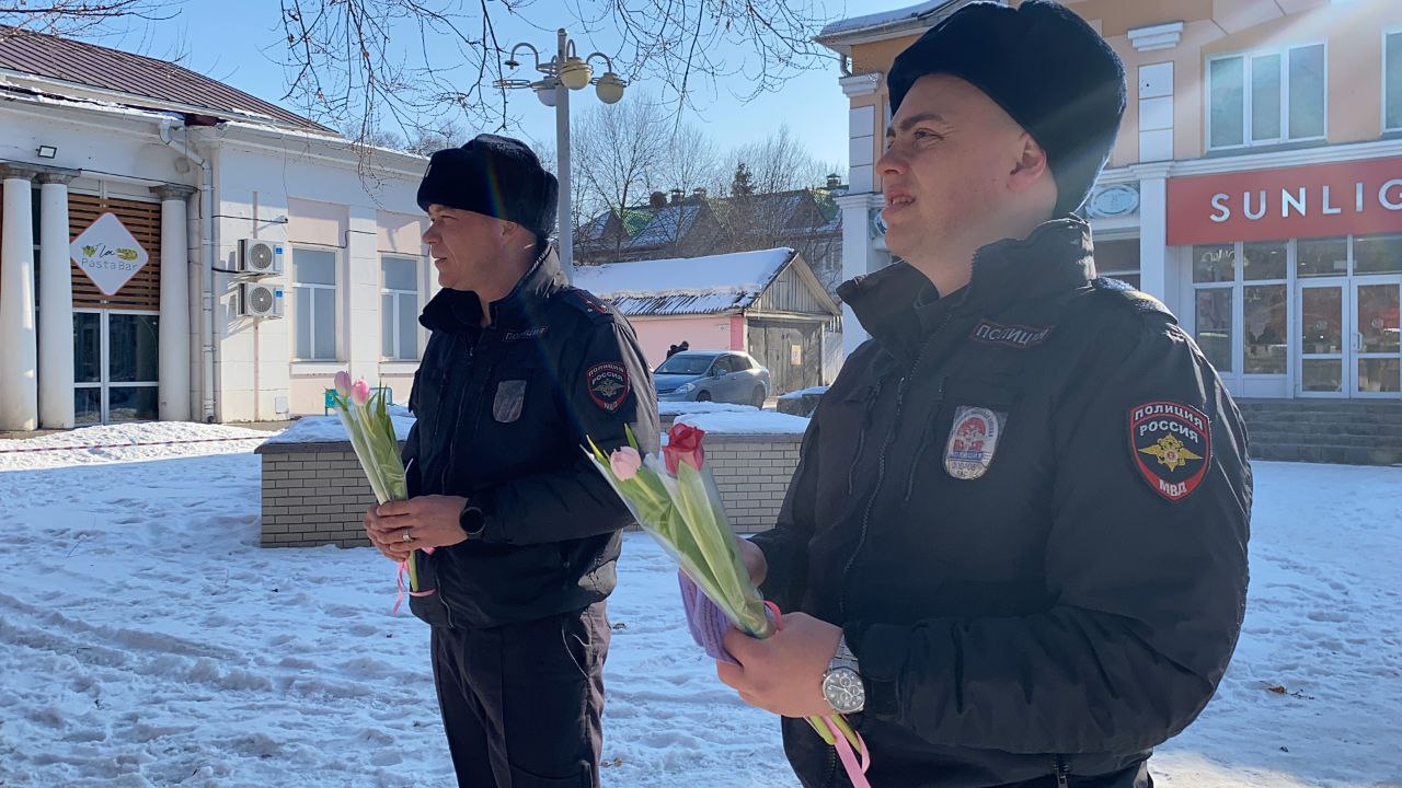 В рамках акции #8Мартавкаждыйдом заместитель командира взвода ОР ППСП старший лейтенант полиции Вячеслав Ростовцев и полицейский ОР ППСП старший сержант полиции Сергей Козлов вышли на улицы родного города, чтобы лично поздравить представительниц прекрасного пола с праздником.