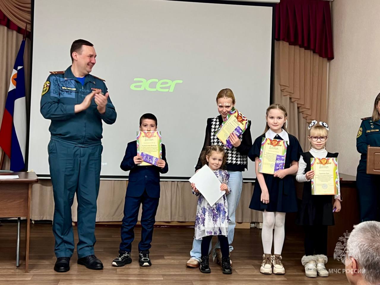 детей сотрудников ведомства, участвовавших в конкурсе к 100-летию Государственного пожарного надзора поощрили грамотами и сладкими подарками. В числе призеров: