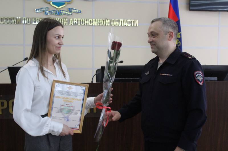 Врио начальника МО МВД России «Биробиджанский» Петр Матвеенко вручил благодарность сотруднице одного из местных отделений банка за профессионализм и оперативность, проявленные при предотвращении особо крупного мошенничества.
