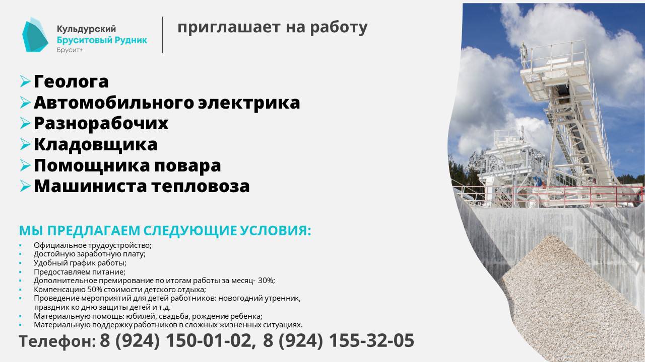 ООО "Кульдурский бруситовый рудник" приглашает на работу: