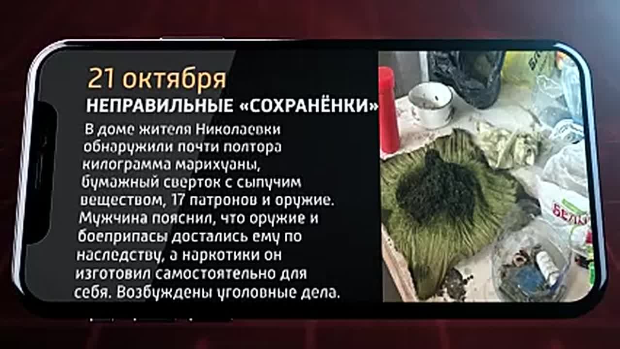 В доме жителя Николаевки обнаружили почти полтора килограмма марихуаны, бумажный сверток с сыпучим веществом, 17 патронов и оружие. Мужчина пояснил, что оружие и боеприпасы достались ему по наследству, а наркотики он изготовил самостоятельно для себя. Возбуждены уголовные дела.