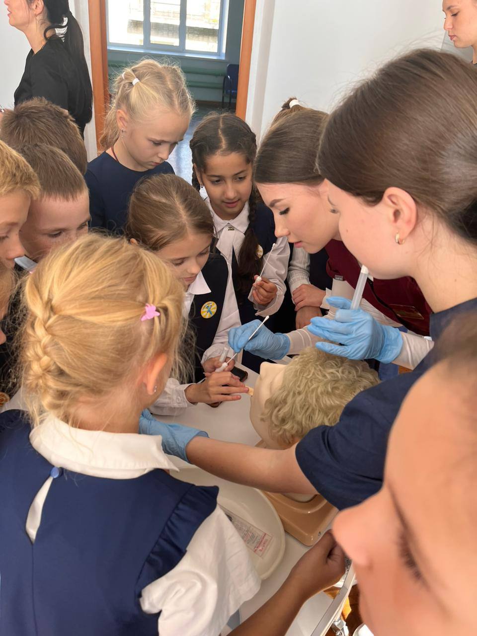 Здесь не просто рассказывают о профессии, а показывают и разрешают попробовать. Под руководством студентов колледжа ребята сами выполняют аускультацию, накладывают шины и повязки, ставят инъекции.