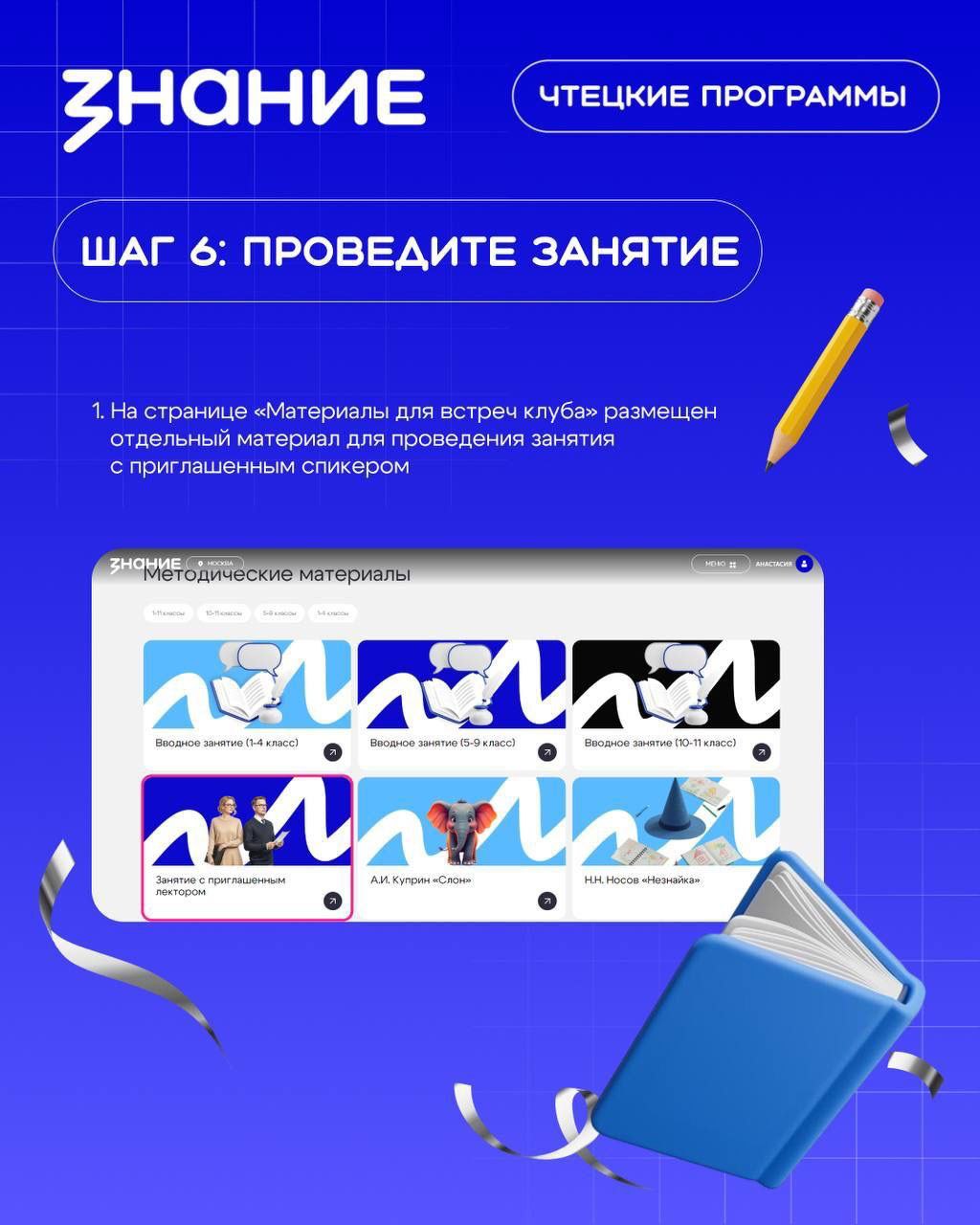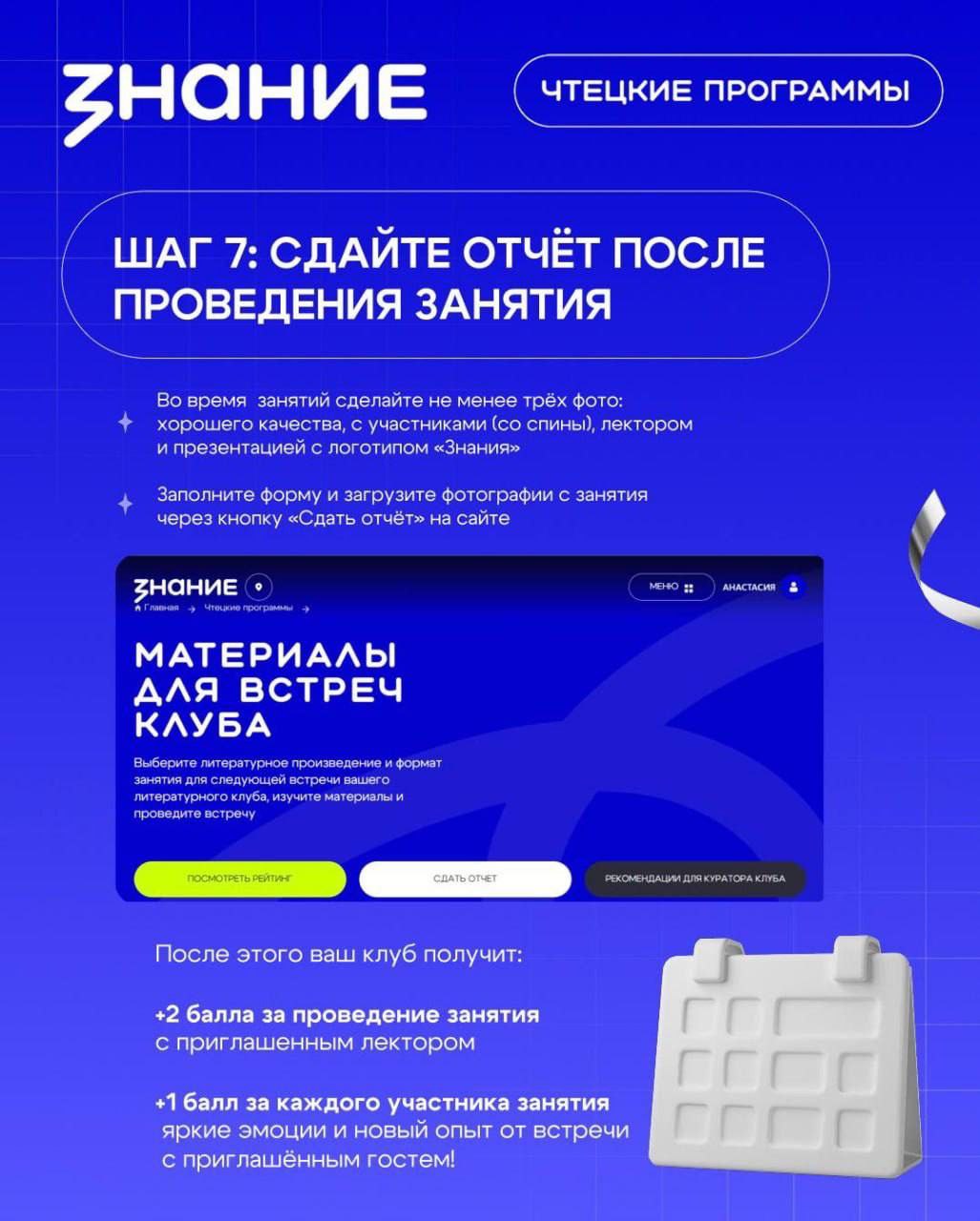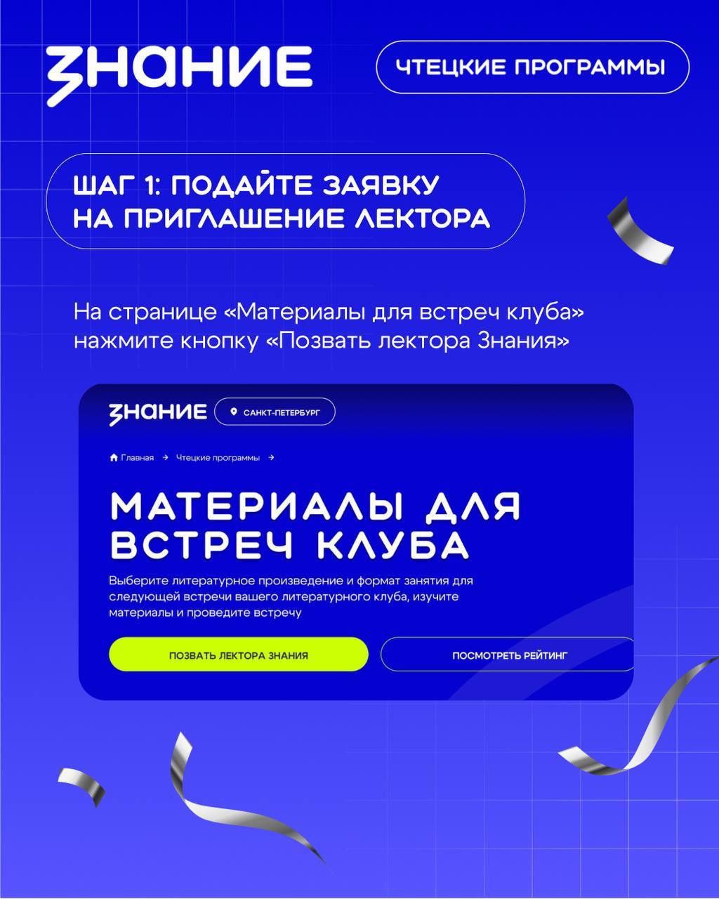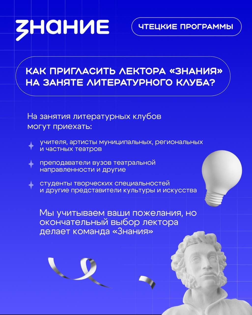 Открыть мир русской классики и зарегистрировать свой литературный клуб можно на сайте Российского общества «Знание» . А после регистрации вы можете пригласить лектора общества «Знание» в ваш клуб! Как это сделать – в наших карточках.