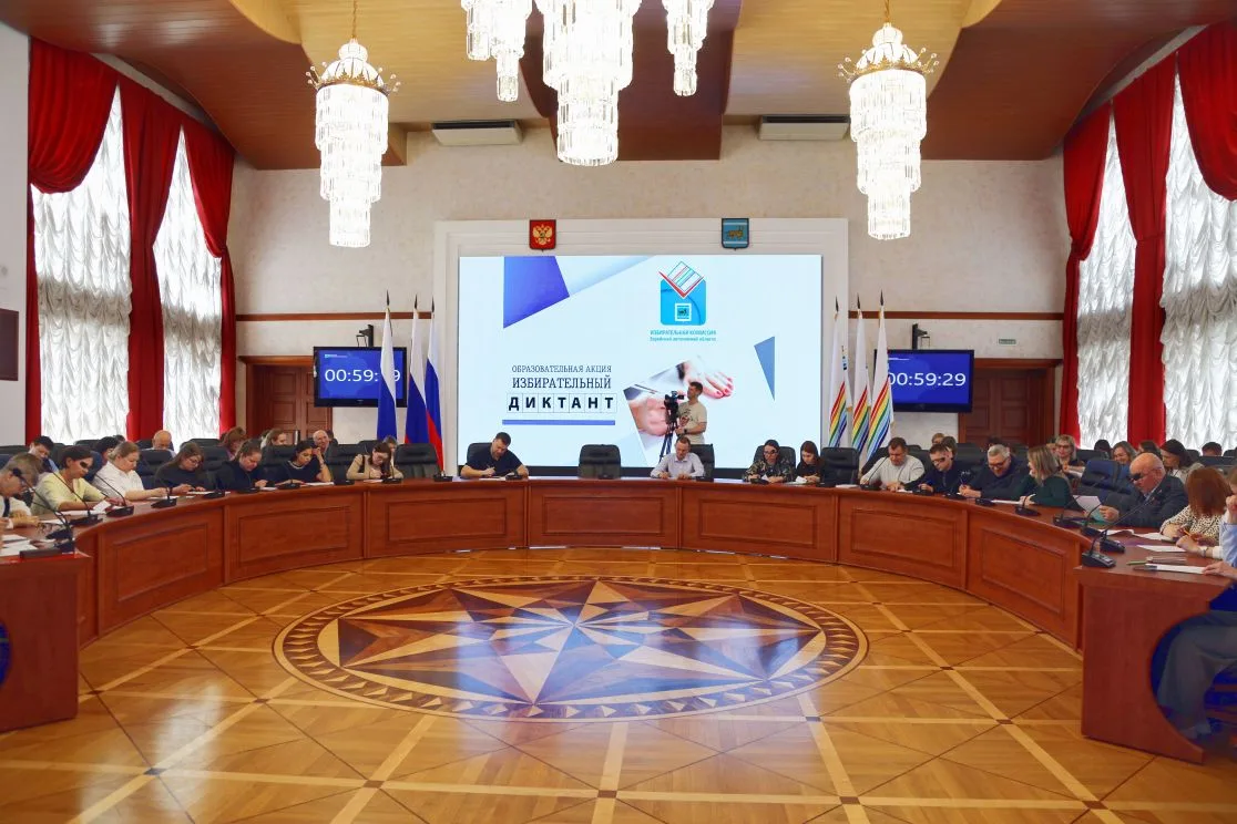 Сегодня депутаты Законодательного Собрания присоединились к участникам ежегодной просветительской акции «Избирательный диктант», организованной избиркомом ЕАО совместно с областной молодежной комиссией и территориальными комиссиями. Вместе с жителями региона парламентарии ответили на вопросы о нормах Конституции России, избирательной системе страны, принципах работы избирательных комиссий и т.п.