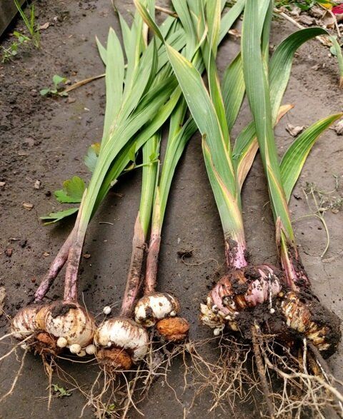 - Закончите сезон с тщательным уходом: обрежьте листву, очистите клубни и удалите старые, усохшие клубнелуковицы.
