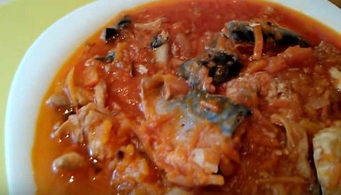 После этого переместить все нарезанные овощи в большую кастрюлю, добавить сахар, растительное масло и соль. Перемешать и поставить на плиту. Дождаться, пока смесь закипит, затем тушить под крышкой около 1 часа 20 минут, не забывая помешивать. В завершающей стадии добавить лавровый лист и перец горошком, аккуратно перемешать с рыбой.