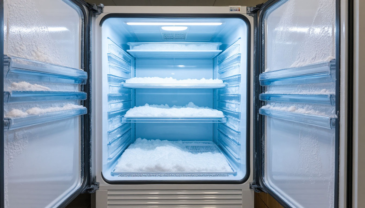 Не забывайте заменять воду в мисках по мере охлаждения, а для ускорения процесса можно воспользоваться вентилятором, направляя горячий воздух прямо в морозильник. Как только лед начнет осыпаться, аккуратно убирайте его с помощью лопатки.