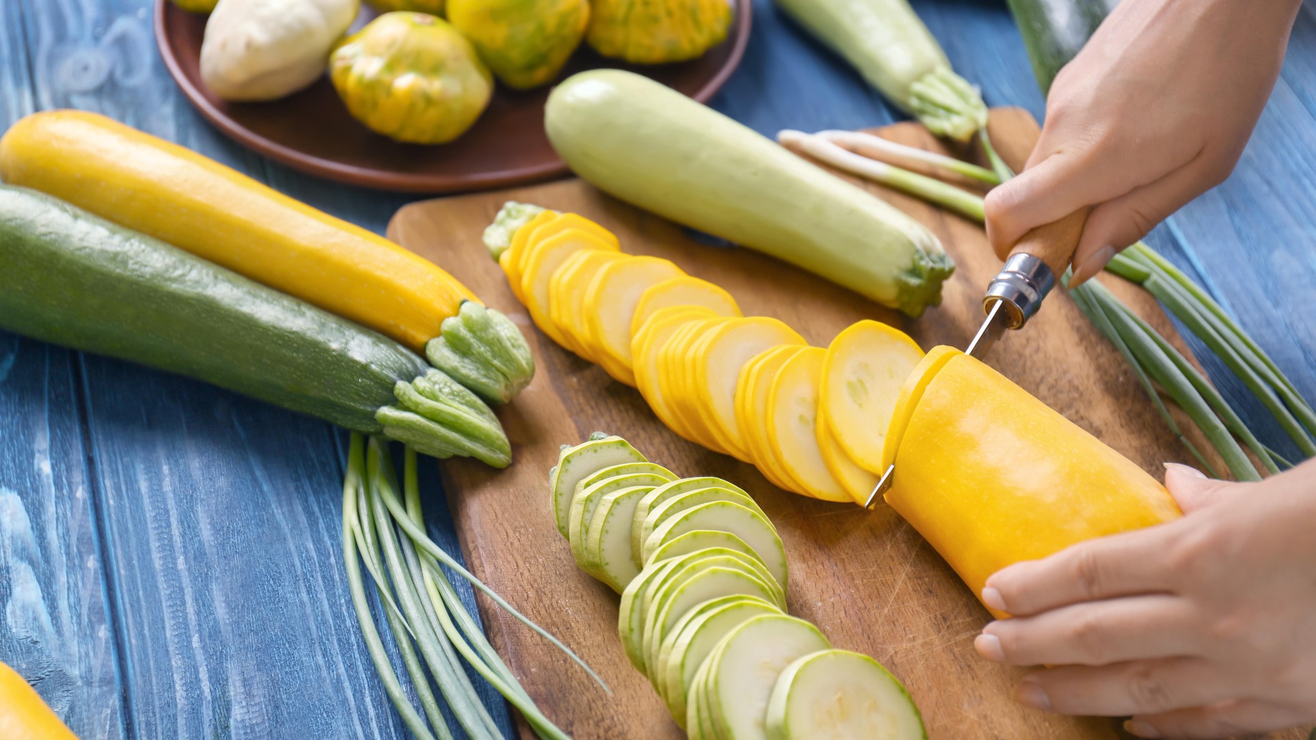 Кабачки разрежьте вдоль. Каждую половинку разделите надвое. Сделайте в ней 3–4 надреза.