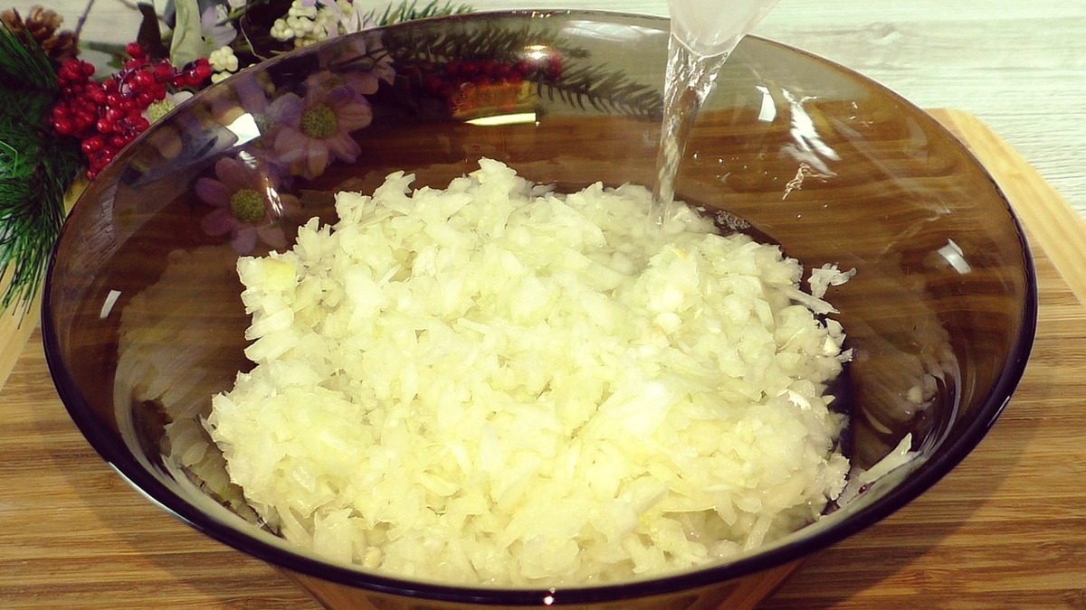 Способ приготовления прост: сначала необходимо мелко нарезать лук, а затем залить его кипятком на 10 минут. Это позволит избавиться от горечи и сделать его вкус более мягким. После этого лук хорошо промывают холодной водой и отжимают.