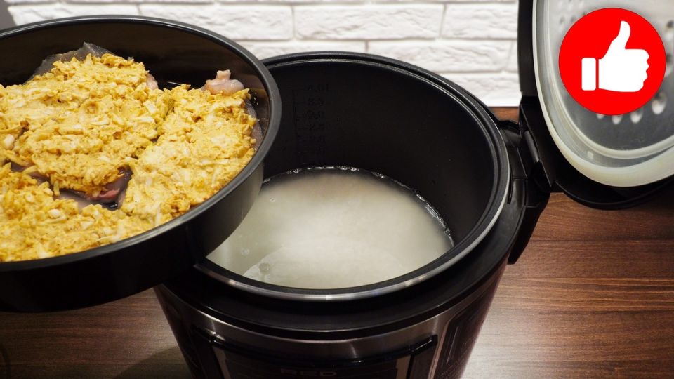 Далее нарезается куриное филе на тонкие ломтики. В чашу мультиварки выкладывается предварительно промытый рис, соль и холодная вода. В корзину для пароварки помещается куриное филе, поверх которого укладывается овощная смесь с яйцами.