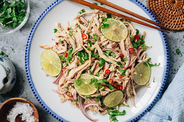 - Сборка салата: Смешайте курицу с чесноком, луком, соевым соусом, уксусом, соком лайма, сахаром и сычуаньским перцем. Украсить рубленой кинзой, чили и подать с дольками лайма.