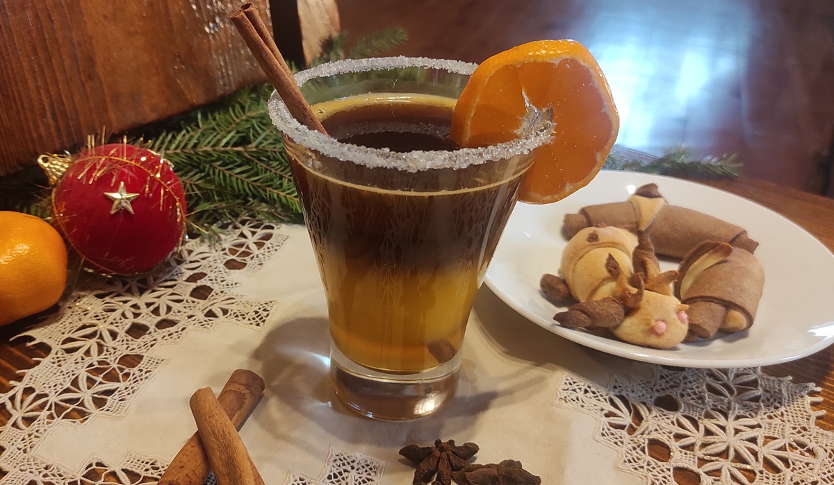 Следующим шагом станет оформление бокала: обмакнув его в мандариновый сок, создать сладкий ободок, обваляв в сахаре. Затем, распределив по слоям рождественский сироп, теплый апельсиновый сок и свежезаваренный кофе, добавить дольку мандарина и палочку корицы для украшения.