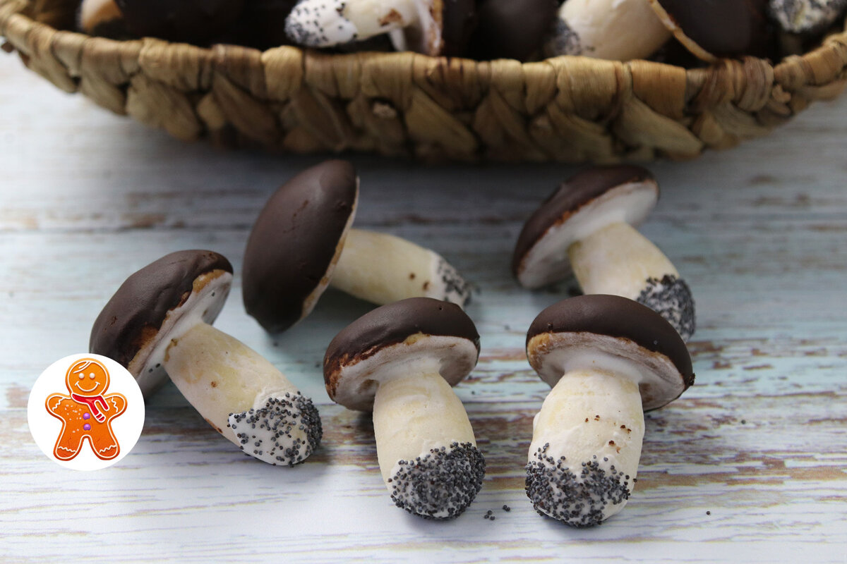 После выпечки шляпок необходимо вырезать углубления для ножек, что удобно делать, пока они еще горячие. Ножки также выпекаются до румяности. Для крепления шляпок и ножек идеально подойдет белковая глазурь, для которой потребуется белок и сахарная пудра. Получившуюся глазурь удобно наносить с помощью кондитерского мешка, а после сборки грибочков можно добавить посыпку из мака и шоколад для декора.