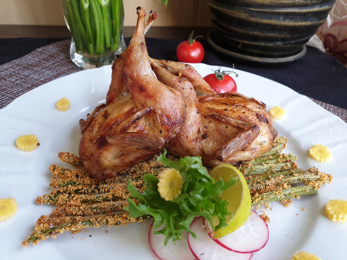 На финальном этапе разогрейте духовку до 180°C и отправьте перепелок на 5 минут для того, чтобы они прогрелись и получили хрустящую корочку. Подавайте их с золотистой спаржей, долькой лимона и свежими овощами. Этот яркий и вкусный рецепт точно приведёт в восторг всех членов семьи, доказывая, что фаст-фуд можно сделать не только быстрым, но и изысканным.