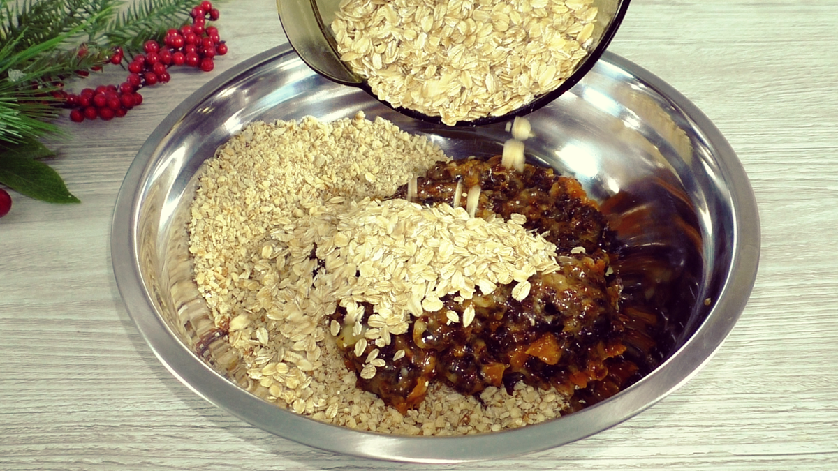 Получившееся пюре добавляется к орехам и семечкам в миску, затем туда же отправляются овсяные хлопья. Аккуратно перемешайте все ингредиенты, чтобы добиться однородной массы. Лучше использовать деревянную ложку или даже руки для полного смешивания.