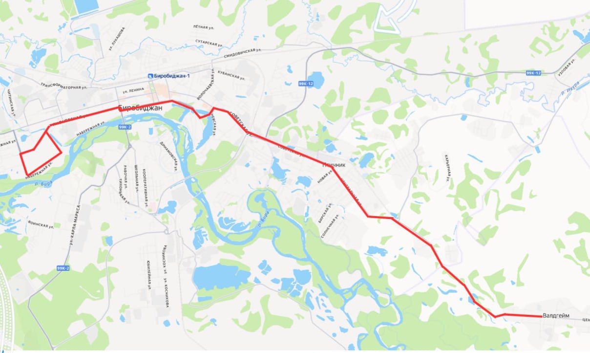 ул. Ленинградская пр. 60-летия СССР ул. Пионерская ул. Бумагина ул. Набережная ул. 40 лет Победы ул. Пионерская пр. 60-летия СССР ул. Ленинградская ул. Советская далее до с. Валдгейм.