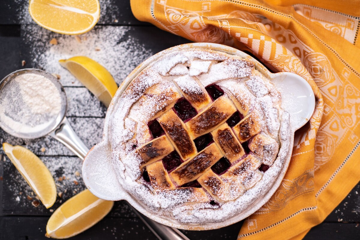 В глубокой миске просеять муку, добавить 50 г сахара и дрожжи, тщательно перемешать.Холодное сливочное масло порезать на кусочки и вмешать в муку, создавая «крошку» до момента, пока масло не начнет нагреваться.Смешать молоко с двумя желтками и влить в мучную смесь, замешивая тесто сначала ложкой, а затем руками.Завернуть готовое тесто в пленку и оставить в холодильнике на 30 минут.Из теста сформировать два шара: один больше, другой меньше. Раскатать больший шар в круг толщиной 3 мм, выложить в форму.Из меньшего шара раскатать пласт толщиной 2 мм и нарезать на длинные полоски шириной 1,5 см.В отдельной миске соединить вишню, сахар, крахмал, лимонную цедру и ванилин. Выложить вишневую начинку на тесто и украсить «клеткой» из полосок теста.Обрезать и запечатать края пирога, смазать взбитым желтком.Запекать пирог в разогретой до 170 градусов духовке в течение 40–55 минут.После выпекания дать пирогу немного остыть, посыпать сахарной пудрой и подавать к столу.Приготовление этого восхитительного пирога подарит море удовольствия и оставит в памяти яркие кулинарные впечатления. Приятного аппетита!