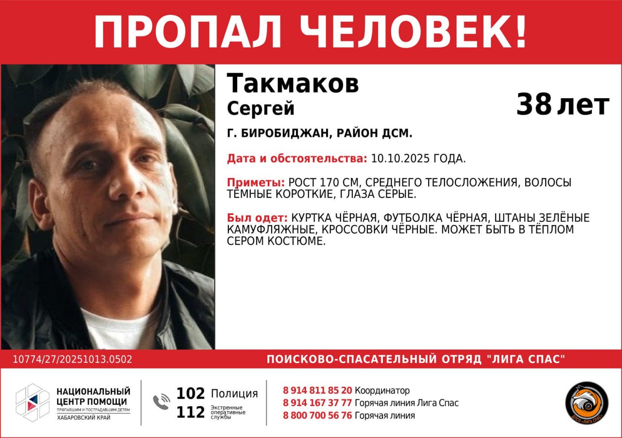 Всех, кто может сообщить какую-либо информацию о местонахождении Сергея, просим позвонить по телефонам: +7 914 811 85 20; +7 914 167 37 77; 102.