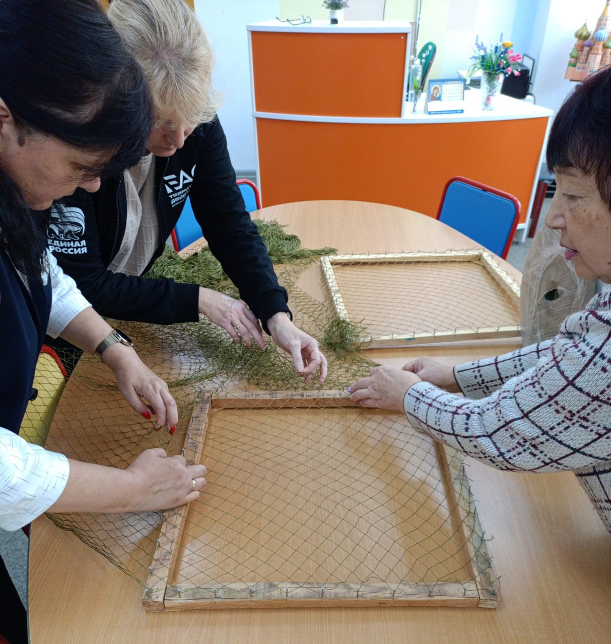 Каждый нашлемник создаётся с предельной тщательностью. На деревянный подрамник размером 50х50 см с набитыми гвоздиками по периметру натягивается сеть-основа с ячейкой 2х2 см, дальше произвольным способом вплетаются нарезки камуфляжного спанбонда в виде травки и листиков, а также джутовая нить для декора. Затем по крайнему ряду основы продергивается резинка и связывается узлом. После этого каждый нашлемник примеряется на военную каску, чтобы наглядно видеть всё ли получилось правильно. И защитная экипировка готова!