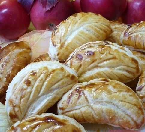 Когда яблочный мусс остынет, раскатайте лист слоеного теста. Вырежьте из теста круги при помощи формы для печенья — обычно получается около десяти штук. На одну половину каждого круга выложите чайную ложку яблочного мусса, затем сложите круг пополам и аккуратно прижмите края.