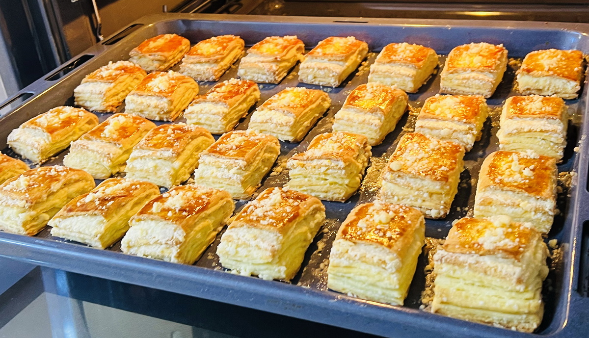 Когда тесто немного отдохнет, его следует разделить на четыре равные части и скатать в шарики. Каждый шарик раскатывается в тонкий корж, на который распределяется начинка. Затем складываем коржи друг на друга, образуя слои с начинкой между ними. Каждый элемент потом делится на порции и выкладывается на противень.