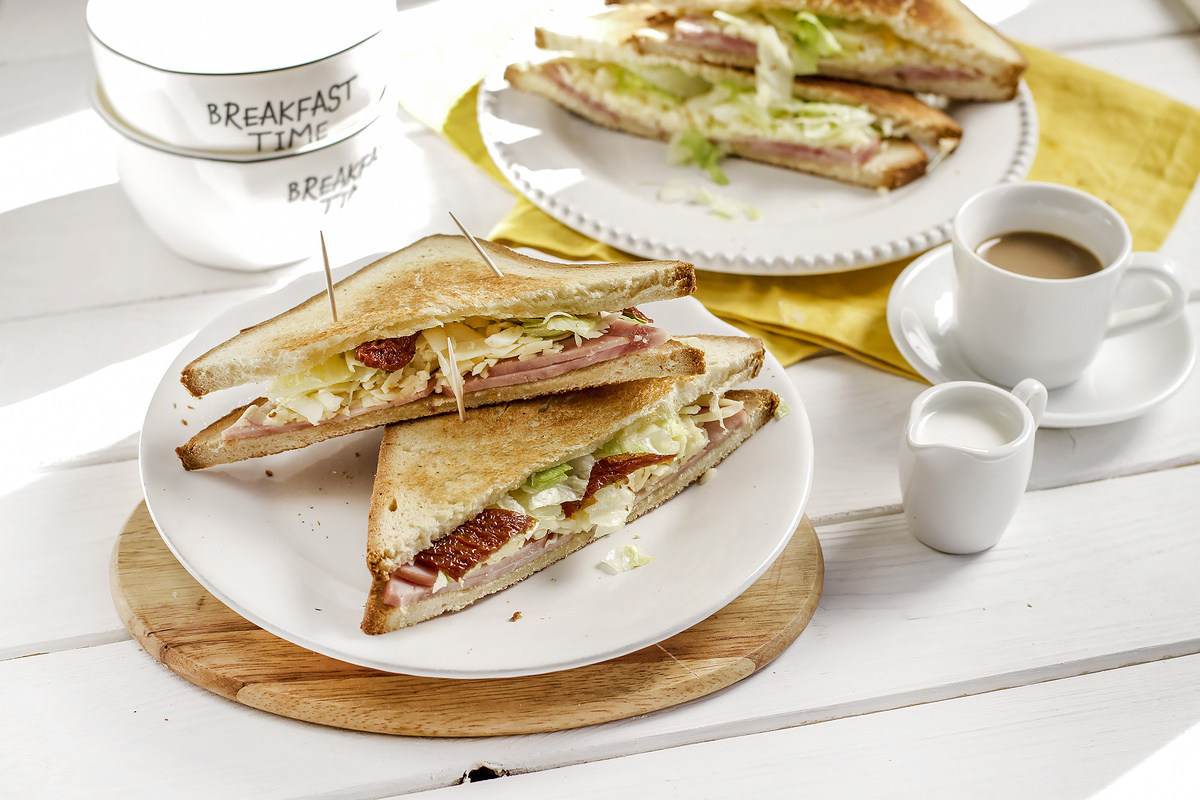Шаг 2: Вернитесь к той же сковороде и продолжайте готовить сэндвичи на среднем огне. Прогревайте их по одной минуте с каждой стороны. Затем снимите с огня, нарежьте тосты на 2 или 4 части и добавьте между ними вяленые томаты и свежий салат Айсберг. Подавайте сэндвич горячим, чтобы максимально насладиться его вкусом.