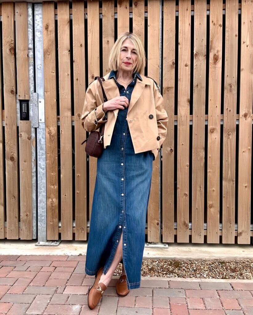 - Джинсовое платье макси — настоящая находка для повседневного образа. Оно удобно и легко комбинируется с укороченным плащом или тренчем, а коричневые лоферы придадут ощущения стиля.
