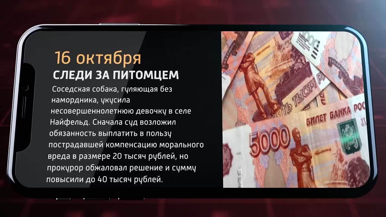 Соседская собака, гуляющая без намордника, укусила несовершеннолетнюю девочку в селе Найфельд. Сначала суд возложил обязанность выплатить в пользу пострадавшей компенсацию морального вреда в размере 20 тысяч рублей, но прокурор обжаловал решение и сумму повысили до 40 тысяч рублей.