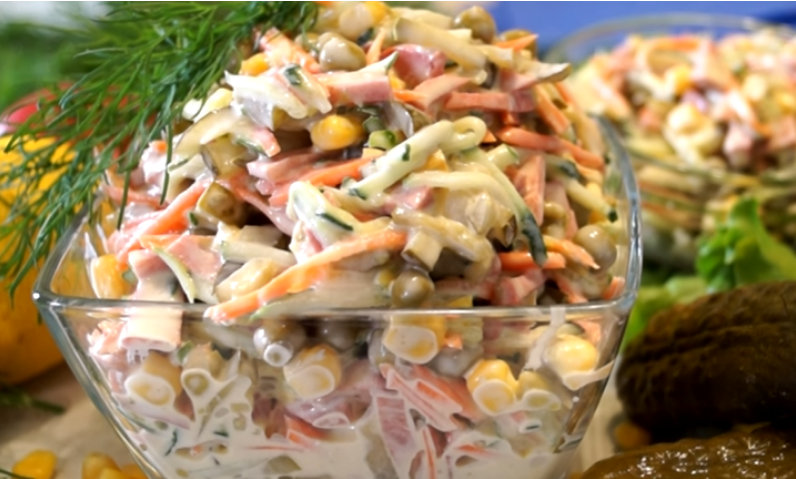Теперь начинается самое интересное — сборка салата! В глубокой миске объедините натертую морковь, колбасу, зеленый горошек и кукурузу, добавьте нарезанные огурцы. Приправьте по вкусу солью, добавьте майонез и тщательно перемешайте. Несмотря на простоту ингредиентов, блюдо получается невероятно вкусным и насыщенным.