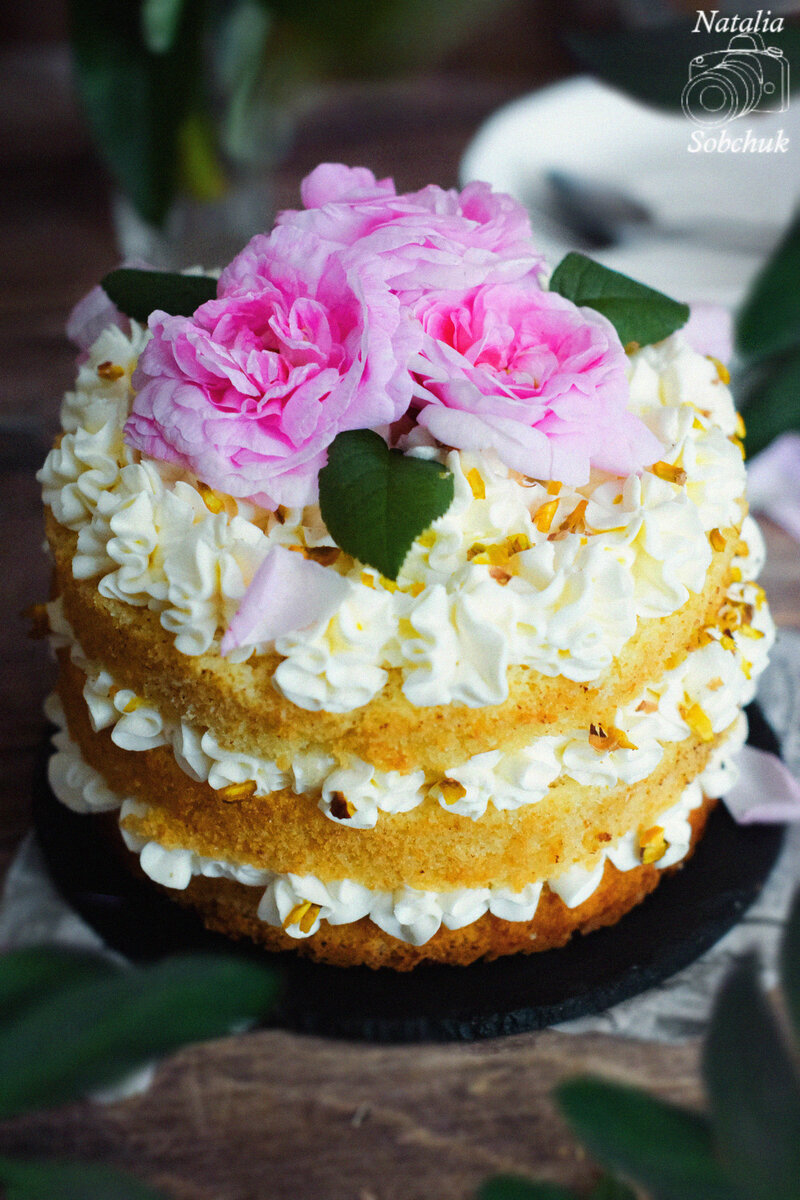 На подготовленные коржи наносите пропитку, затем слои крема и джем, чередуя их. После завершения сборки, рекомендуется оставить торт в холодильнике для пропитки хотя бы на пару часов или на всю ночь. Декорируйте на свой вкус — можно использовать живые цветы или фисташки.
