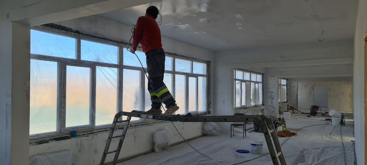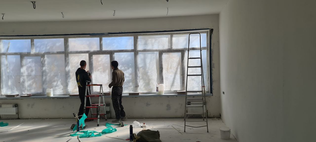 В настоящее время строители ведут штукатурно-малярные работы, заливают полы. На четвертом этаже ведут покраску кабинетов и в коридоре. Специалисты провели полную замену деревянных окон на пластиковые. Это позволит значительно снизить теплопотери зимой и обеспечить оптимальный микроклимат в классах круглый год.