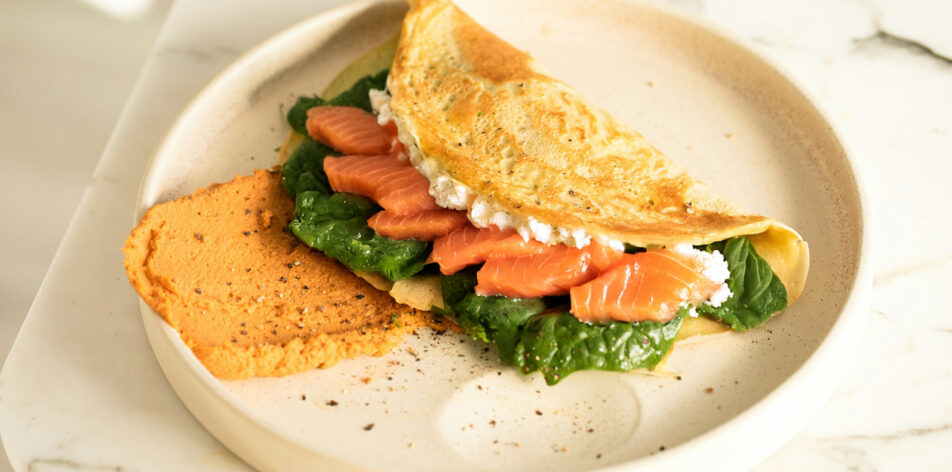 3. Готовый блин: на него выложите творожный сыр, кусочки лосося и свежую рукколу. Сложите пополам или заверните в рулет — и ваш завтрак готов!