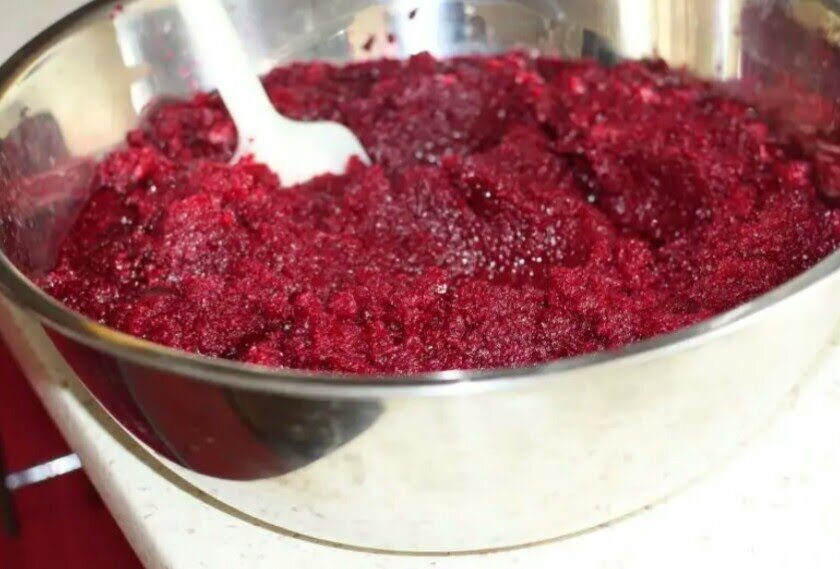 Процесс подготовки свеклы начинается с ее варки или запекания: последний способ помогает сохранить яркий цвет и сладость корнеплода. После того как свекла будет готова, ее необходимо охладить и очистить от кожицы. В это время лук обжаривается до золотистого цвета. Затем оба ингредиента пропускаются через мясорубку — стоит избегать блендера, чтобы сохранить текстуру финального продукта.