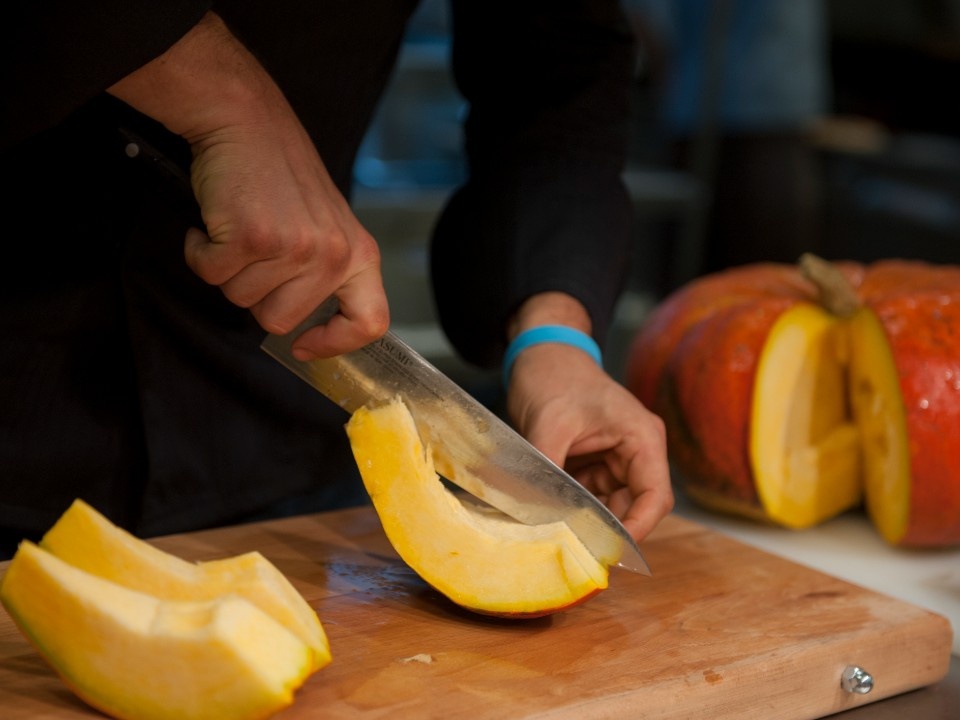 Далее выложите подготовленную тыкву в один слой на противень и поместите в заранее разогретую до 200 °C духовку. Запекайте около 30 минут, однако не забудьте учесть вид тыквы – она должна стать мягкой и слегка подрумяненной.
