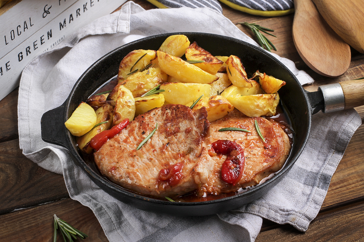 Шаг 3: Пока картошка запекается, раскалите сковороду и добавьте столовую ложку растительного масла. Стейки из свинины посолите и поперчите. Обжарьте их на сильном огне по 1-2 минуты с каждой стороны до золотистой корочки.