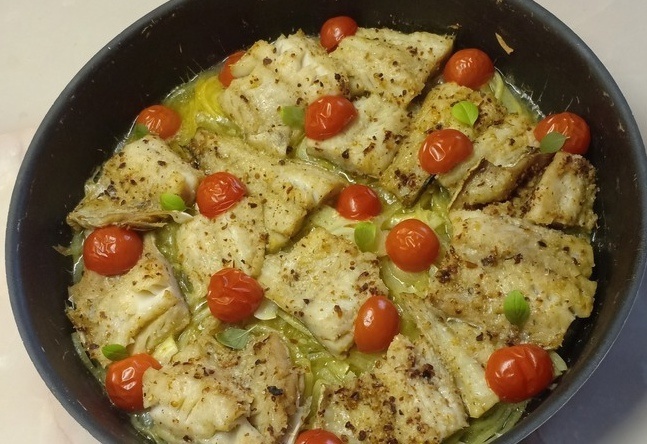 Теперь пришло время активировать духовку: предварительно разогреть до 190 градусов и запекать рыбу под фольгой в течение 20 минут. После этого, настало время добавить нарезанные помидоры черри и вернуть форму в духовку еще на 10 минут, сняв фольгу. Если используется фольга в начале, помидоры можно оставить на потом.
