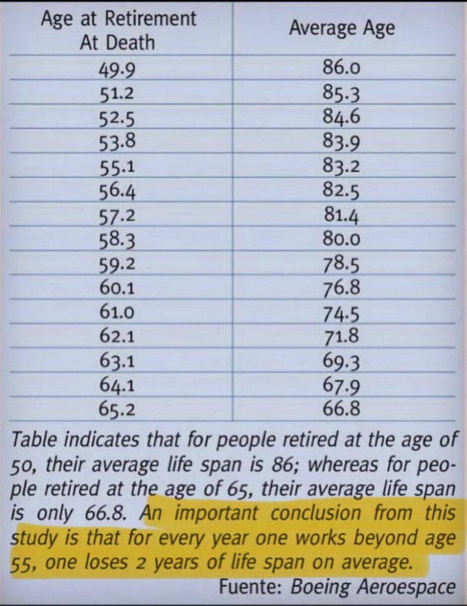 Недавнее исследование, проведенное Boeing Aerospace, выявило интересную взаимосвязь между возрастом выхода на пенсию и продолжительностью жизни. Оказывается, люди, которые выходят на работу в возрасте 50 лет, в среднем живут до 86 лет. В то время как те, кто остается в трудовом режиме до 65 лет, доживают лишь до 66,8 лет. Каждое дополнительное рабочее время после 55 сокращает жизнь почти на два года, сообщает Дзен-канал "Дьяков Александр Запуск Брендов".