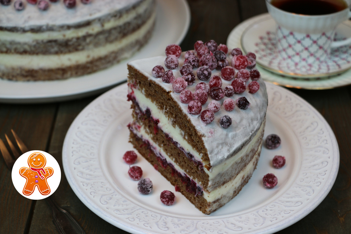 Изюминкой торта станут украшения из засахаренной клюквы и белковой глазури, что придаст ему финальный штрих изящества. В результате получится пространство для зимней сказки на вашем праздничном столе, который порадует и удивит всех гостей.