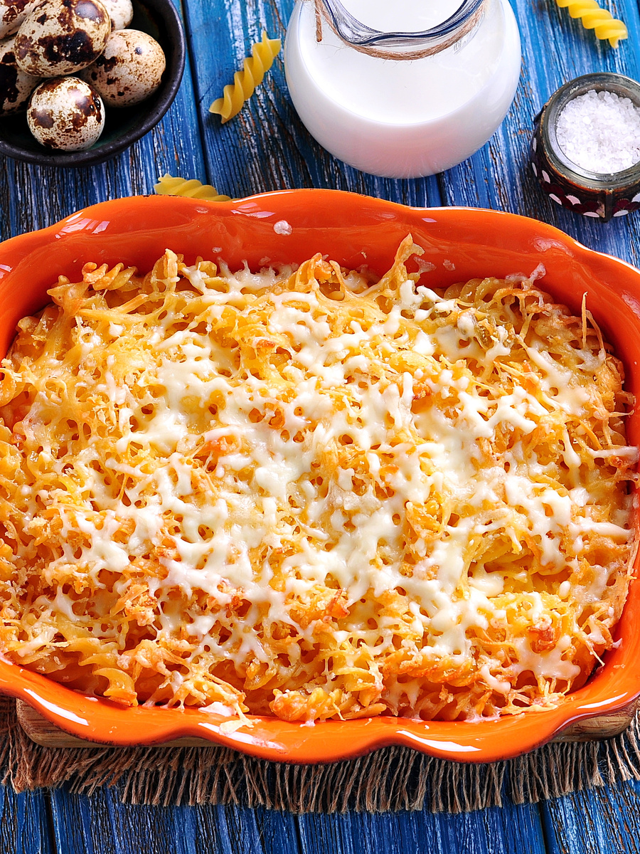 5. Формируем запеканку. Выложите макароны с сыром в смазанную маслом форму для запекания, равномерно залейте яйчно-молочной смесью. Сверху посыпьте панировочными сухарями и остатками сыра для золотистой корочки.
