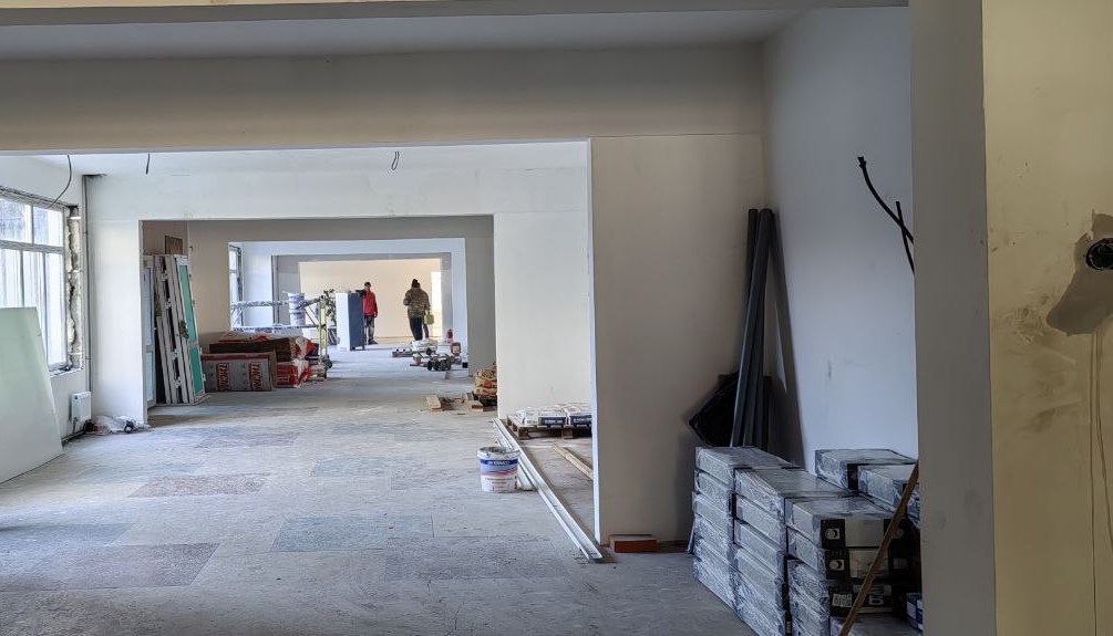 Подрядчик ведет штукатурно-малярные работы, практически везде залили полы. На четвертом этаже идет покраска кабинетов и коридора. В туалетных комнатах укладывают плитку.