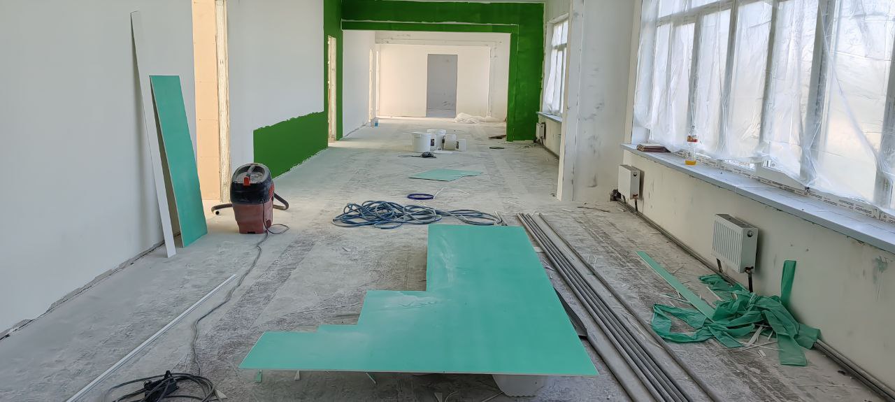 Подрядчик активно занимается штукатурно-малярными работами, а также практически завершил заливку полов. На четвертом этаже ведется покраска кабинетов и коридоров, а в туалетных комнатах укладывается плитка.