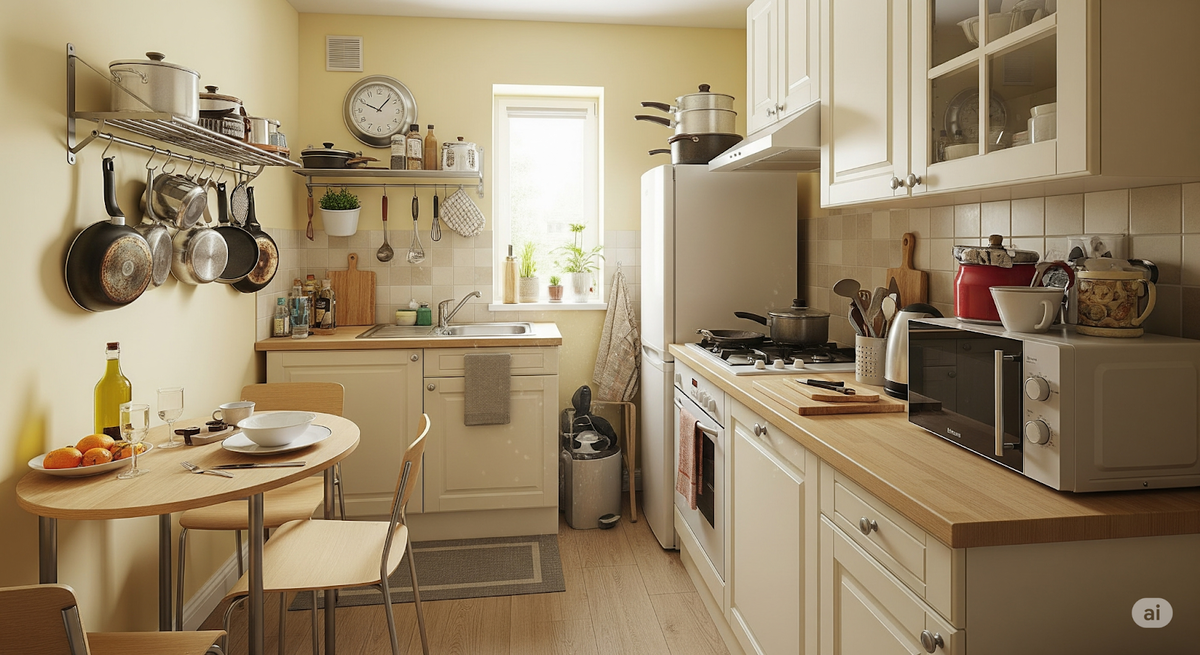 - Перегруженность лишними предметами — столовая посуда, устаревшая техника и мелочи, которые не используются.